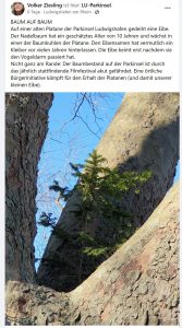 Hier stehen die Verantwortlichen in der Stadt, die eine solche Veranstaltung genehmigen, in der Verantwortung. Denn schon ein herabfallender Platanen-Ast kann großen Schaden anrichten, wie man sich leicht vorstellen kann. Der Zusammenhang zwischen wiederholter Nutzung der Wiese mit den oben beschriebenen Folgen, daraus resultierend geschwächten Platanen mit vermehrtem Pilzbefall und in der Folge wachsender Gefahr durch Astbruch ist durchaus plausibel.