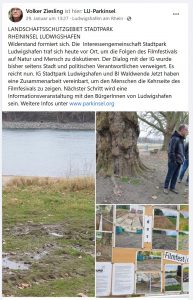 Spannend ist die Vision von Herrn Ziesling, das Landschaftsschutzgebiet naturnäher und in Anlehnung an die Rheinauen zu gestalten, mit Weichholz-Beständen im direkten Überschwemmungsbereich und für Rheinauen typischen Hartholz-Arten in höher gelegenen Teilen des Parks. So könnte die Funktionalität des Landschaftsschutzgebietes bzgl. Stadtklima und Klimaschutz und auch der Hochwasserschutz gestärkt werden. Dieses naturnahe Konzept in direkter städtischer Umgebung dürfte nach seiner Einschätzung auch den Erholungswert des Gebietes für die Ludwigshafener, die in schon jetzt 365 Tage im Jahr frequentieren, deutlich erhöhen. Großveranstaltungen können problemlos auch auf den vielen, bereits versiegelten und für die Natur unbrauchbaren städtischen Flächen stattfinden. Für den naturnahen Uferbereich gibt es keine Alternative und er ist einzigartig. Das ist keine für Ludwigshafen übliche Sicht.