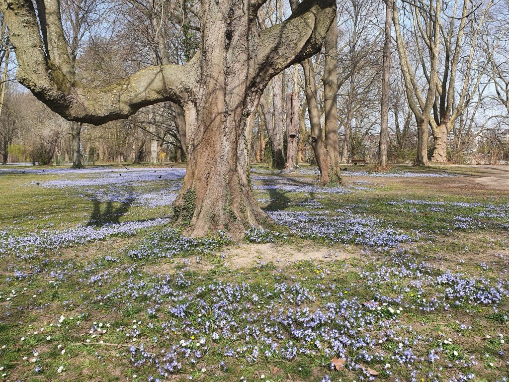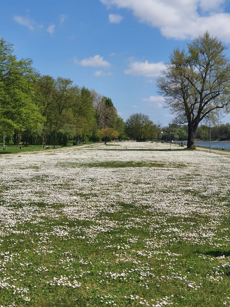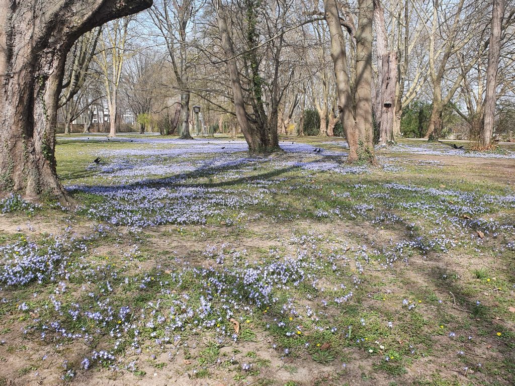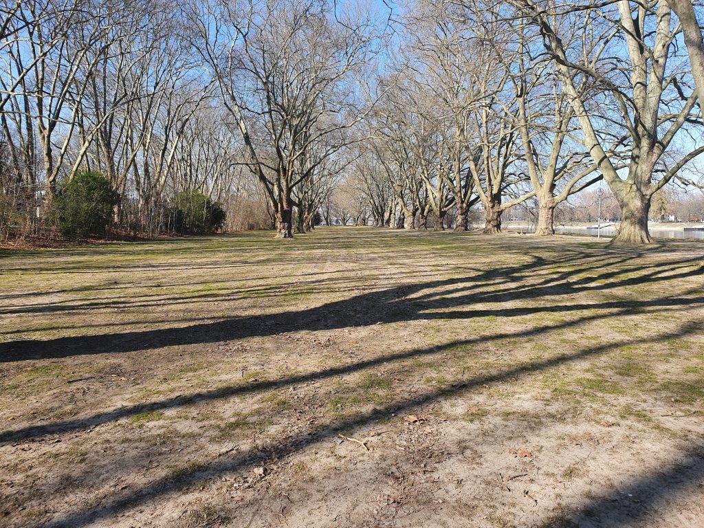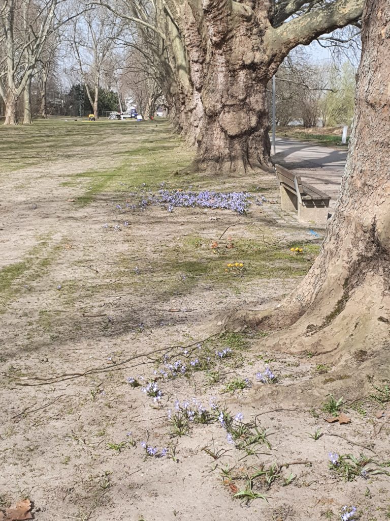 Die große Wiese mit den Platanen zeigt zwar einen zarten grünen Bewuchs des eingesäten Rasens, bei näherer Betrachtung bleibt aber die betonartige Struktur des Bodens unübersehbar und der Rasen hat nichts mit einem Naturrasen zu tun, wie er in den anderen Teilen des Parks vorliegt.