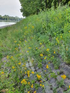 Vielmehr wachsen dort zunehmend Ruderal-Pflanzen, die sich typischerweise dort ansiedeln, wo unbewachsene Erde neu abgelagert wird. Denn der typische Pflanzenbewuchs der Auwiese hat  hier keine Chance zu bestehen oder gar sich auszubreiten, wenn er durch die Befahrung mit schwerem Gerät und Überbauung Jahr für Jahr auf’s Neue im wahrsten Sinne „platt gemacht“ wird. Das Mähen der Au-Wiese – laut Information des Wasserschifffahrtsamts ab dem 15.7.2022 – ist auffallend am Start des Aufbaus des Festivals, nach Mitteilung der Stadt ab 15.7.2022 – orientiert. Ökologische Mähzyklen sehen hingegen Schnitte im Frühsommer und Frühherbst vor (BUND).