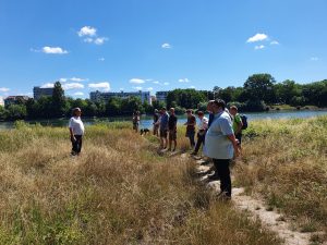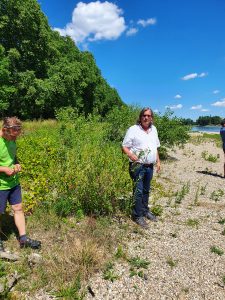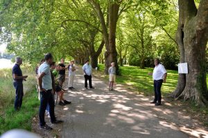 Ca. 15 Interessierte waren der Einladung gefolgt, um sich kurz vor dem geplanten Beginn der Aufbauarbeiten am 15. Juli gemeinsam mit Diplom-Forstwirt Volker Ziesling ein Bild vom aktuellen Zustand des Parks, der Wiese und des Uferbereichs zu machen.
